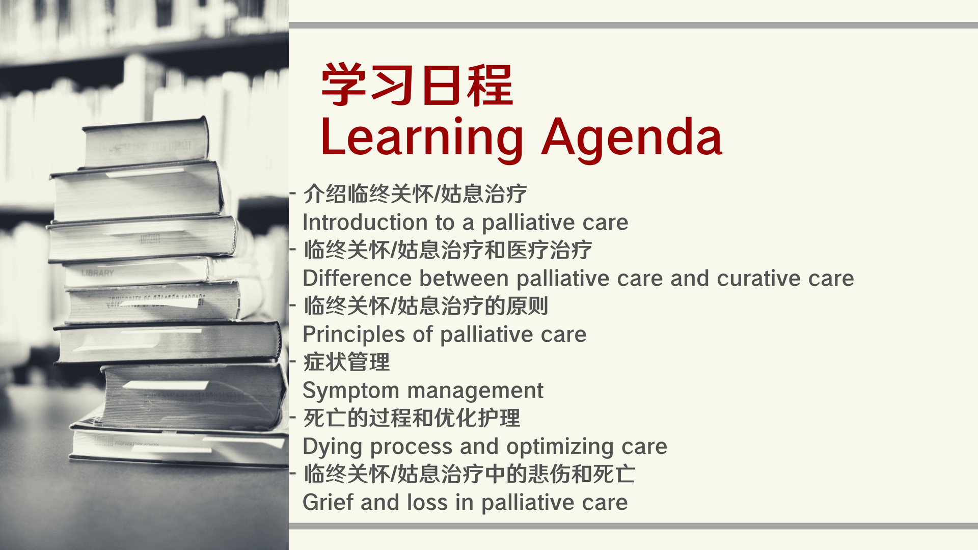 希望帮助末期病人了解死亡,进而接纳死亡的事实,使自己活得更象真正的自己,提高生存质量,维护人的尊严;另一个目的,是希望给予病患家属精神支持,给予他们承受所有事实的力量,进而坦然的接受一切即将面对的问题。
